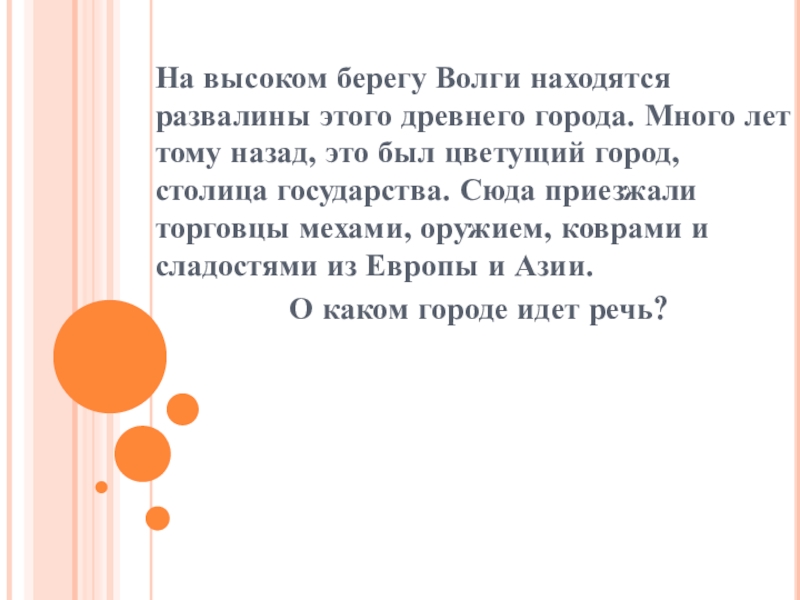 Слайд 8На высоком берегу Волги находятся развалины этого древнего города. Много лет