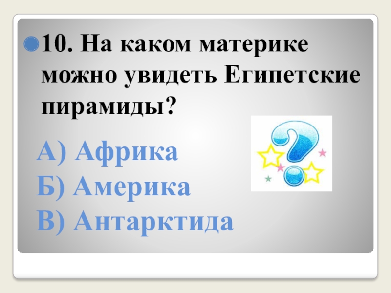 А) Африка Б) Америка В) Антарктида10. На каком материке можно увидеть Египетские пирамиды?