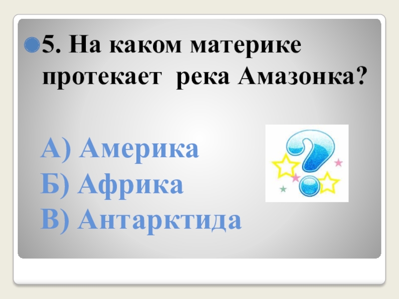 А) Америка Б) Африка В) Антарктида5. На каком материке протекает река Амазонка?