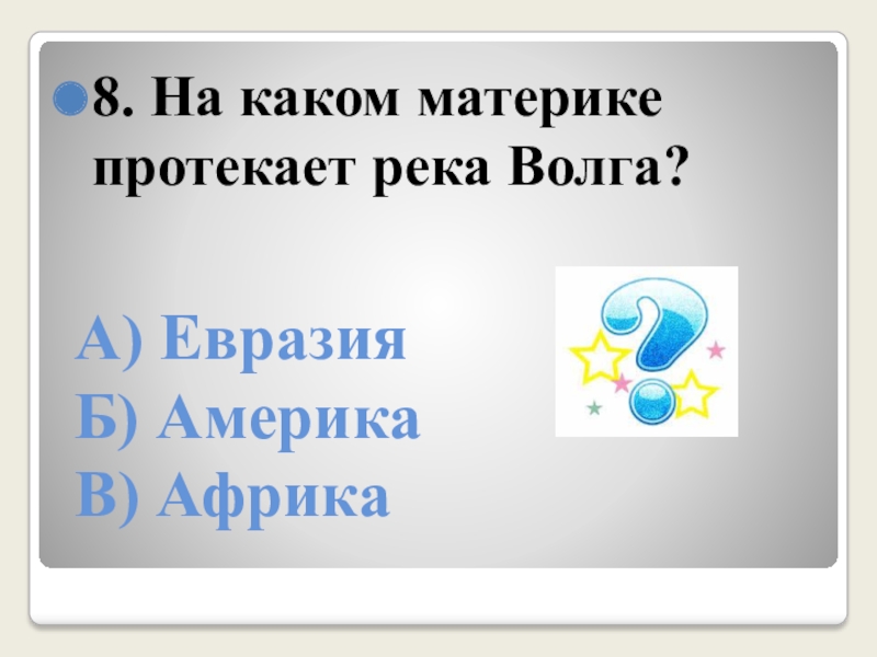 А) Евразия Б) Америка В) Африка8. На каком материке протекает река Волга?