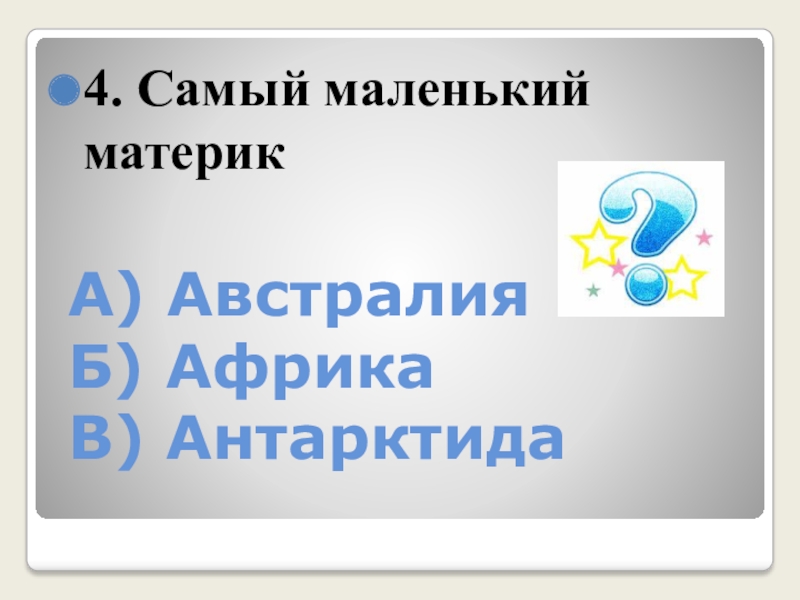 А) Австралия Б) Африка В) Антарктида4. Самый маленький материк