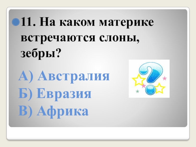 А) Австралия Б) Евразия В) Африка11. На каком материке встречаются слоны, зебры?