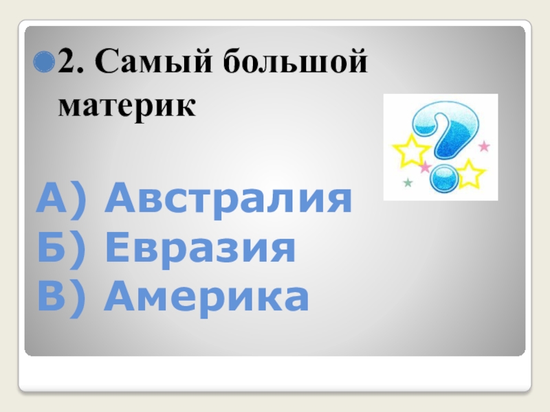 А) Австралия  Б) Евразия В) Америка2. Самый большой материк