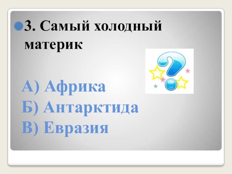 А) Африка Б) Антарктида В) Евразия3. Самый холодный материк