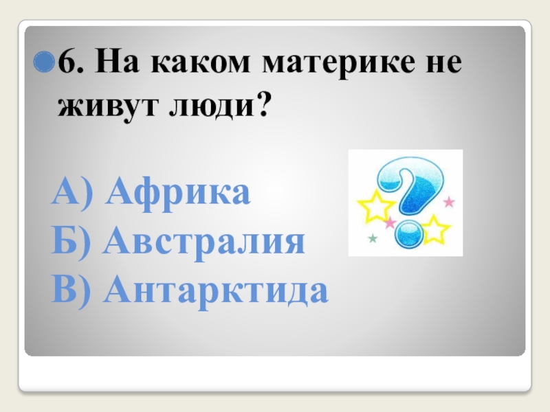 А) Африка Б) Австралия В) Антарктида6. На каком материке не живут люди?