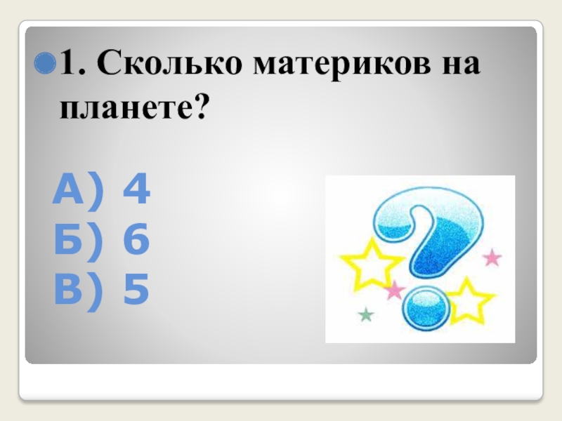 А) 4 Б) 6 В) 51. Сколько материков на планете?