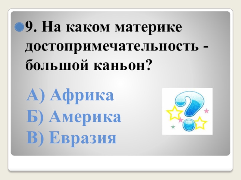 А) Африка Б) Америка В) Евразия9. На каком материке достопримечательность -большой каньон?
