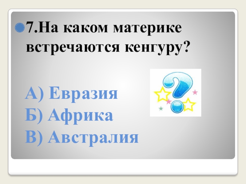 А) Евразия Б) Африка В) Австралия7.На каком материке встречаются кенгуру?