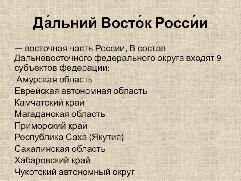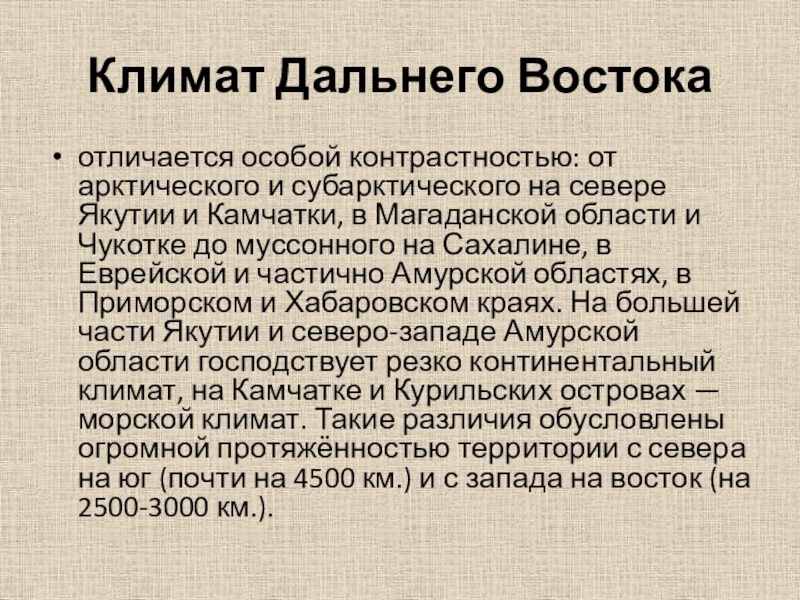 севере Якутии и Камчатки, в Магаданской области и Чукотке до муссонного на Сахалине, в Еврейской и частично Амурской областях, в Приморском и Хабаровском краях. На большей части Якутии и северо-западе Амурской области господствует резко континентальный климат, на Камчатке и Курильских островах — морской климат. Такие различия обусловлены огромной протяжённостью территории с севера на юг (почти на 4500 км.) и с запада на восток (на 2500-3000 км.).