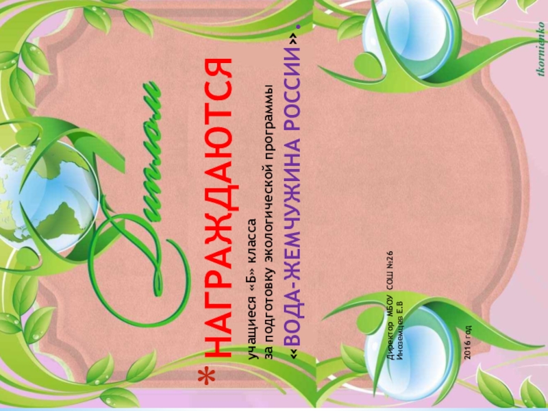 Слайд 17НАГРАЖДАЮТСЯ учащиеся «Б» класса за подготовку экологической программы «ВОДА-ЖЕМЧУЖИНА РОССИИ». Директор МБОУ СОШ №26 Иноземцев Е.В 2016
