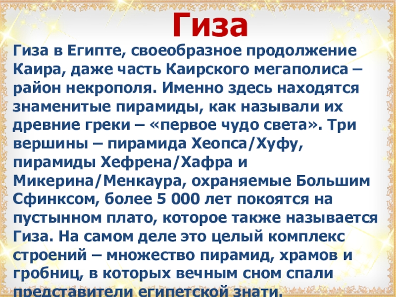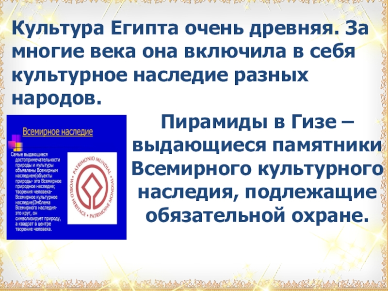 Пирамиды в Гизе – выдающиеся памятники Всемирного культурного наследия, подлежащие обязательной охране.