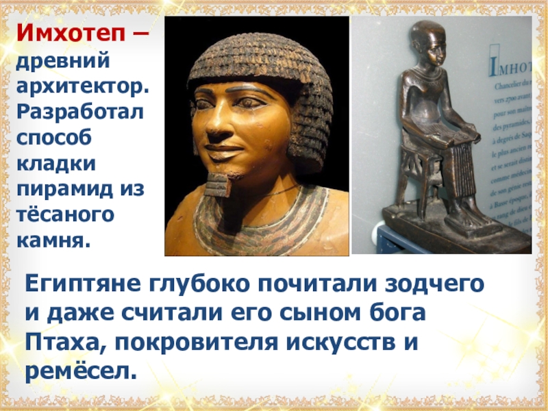 Египтяне глубоко почитали зодчего и даже считали его сыном бога Птаха, покровителя искусств и ремёсел.