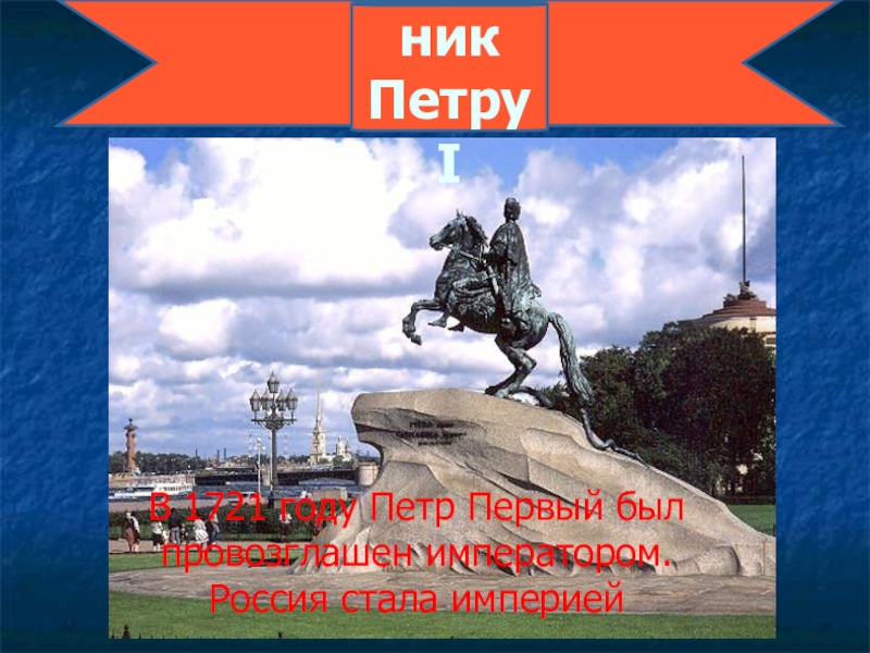 Памятник Петру IВ 1721 году Петр Первый был провозглашен императором. Россия стала империей