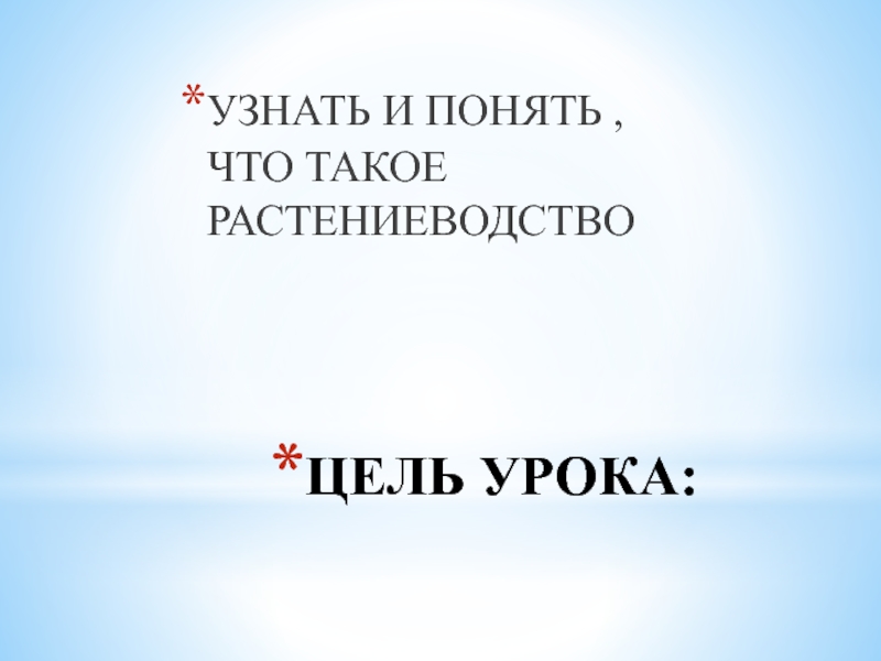 ЦЕЛЬ УРОКА:УЗНАТЬ И ПОНЯТЬ , ЧТО ТАКОЕ РАСТЕНИЕВОДСТВО