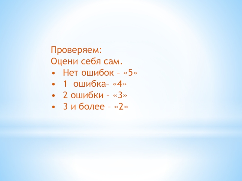Проверяем: Оцени себя сам. •	Нет ошибок – «5»•	1 ошибка– «4»•	2 ошибки – «3»•	3 и более – «2»