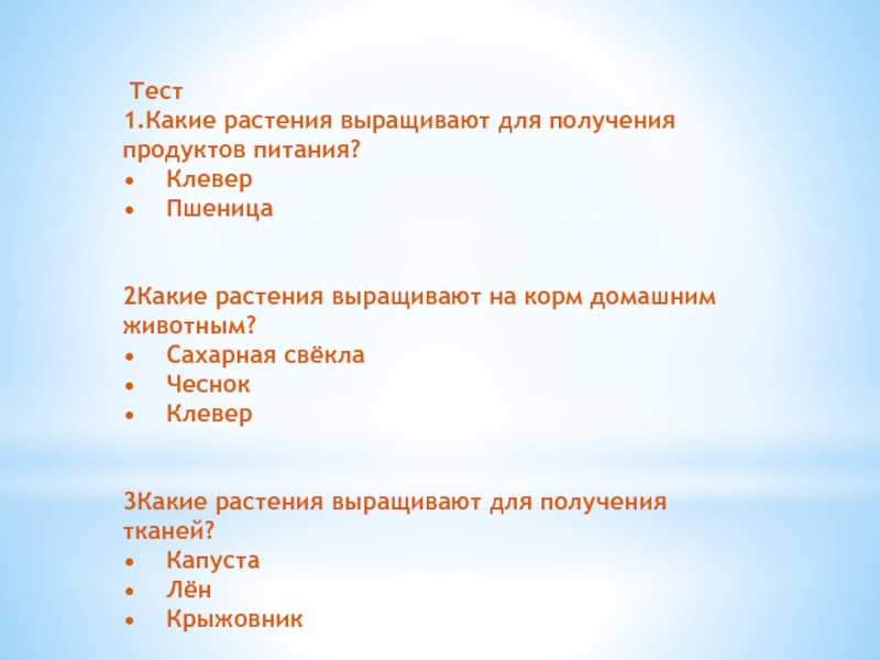 Тест1.Какие растения выращивают для получения продуктов питания?•	Клевер•	Пшеница2Какие растения выращивают на корм домашним животным?•	Сахарная свёкла•	Чеснок•	Клевер3Какие растения выращивают