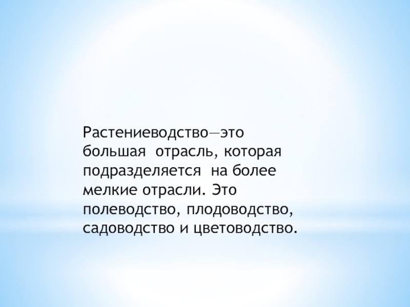 Слайд 13Растениеводство—это большая отрасль, которая подразделяется на более мелкие отрасли. Это полеводство,