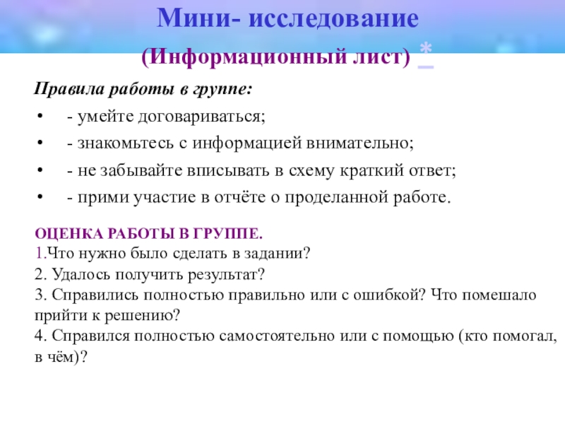 ОЦЕНКА РАБОТЫ В ГРУППЕ.