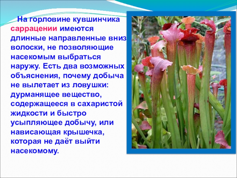 Слайд 26 На горловине кувшинчика саррацении имеются длинные направленные вниз волоски,