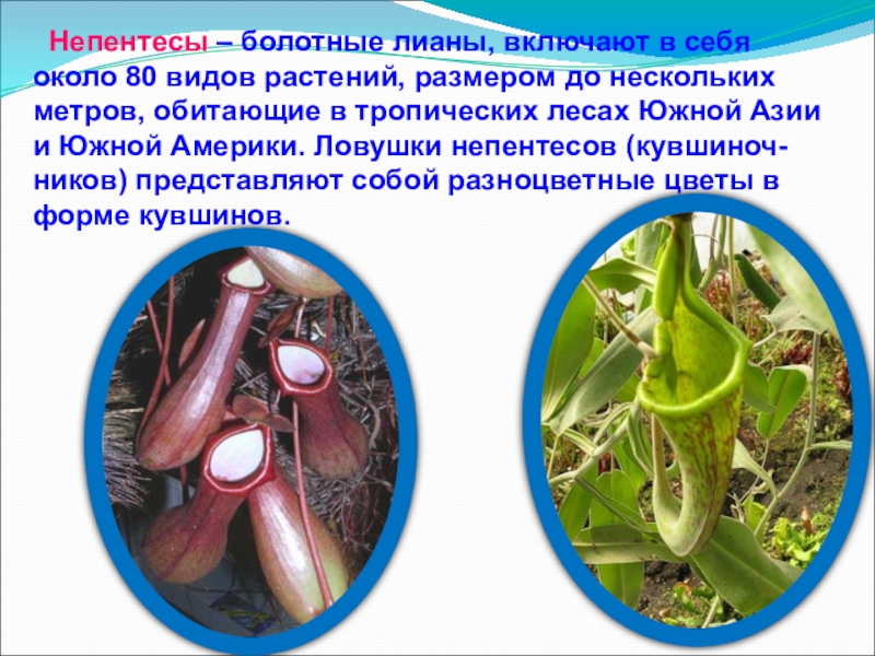 Слайд 22 Непентесы – болотные лианы, включают в себя около 80 видов