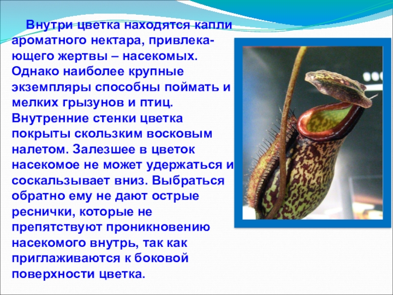 насекомых. Однако наиболее крупные экземпляры способны поймать и мелких грызунов и птиц. Внутренние стенки цветка покрыты скользким восковым налетом. Залезшее в цветок насекомое не может удержаться и соскальзывает вниз. Выбраться обратно ему не дают острые реснички, которые не препятствуют проникновению насекомого внутрь, так как приглаживаются к боковой поверхности цветка.