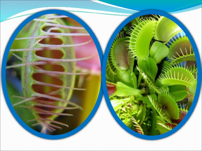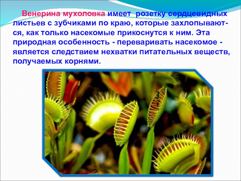 Слайд 12 Венерина мухоловка имеет розетку сердцевидных листьев с зубчиками по