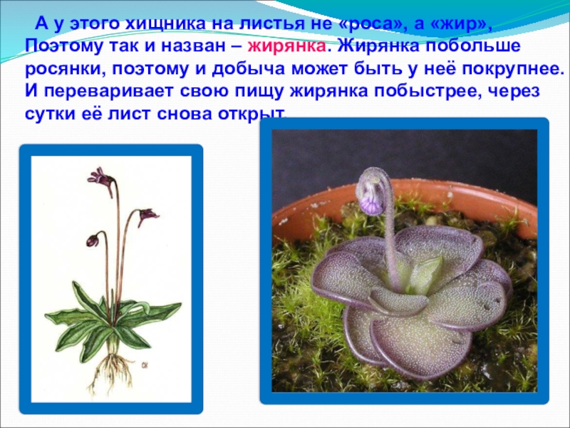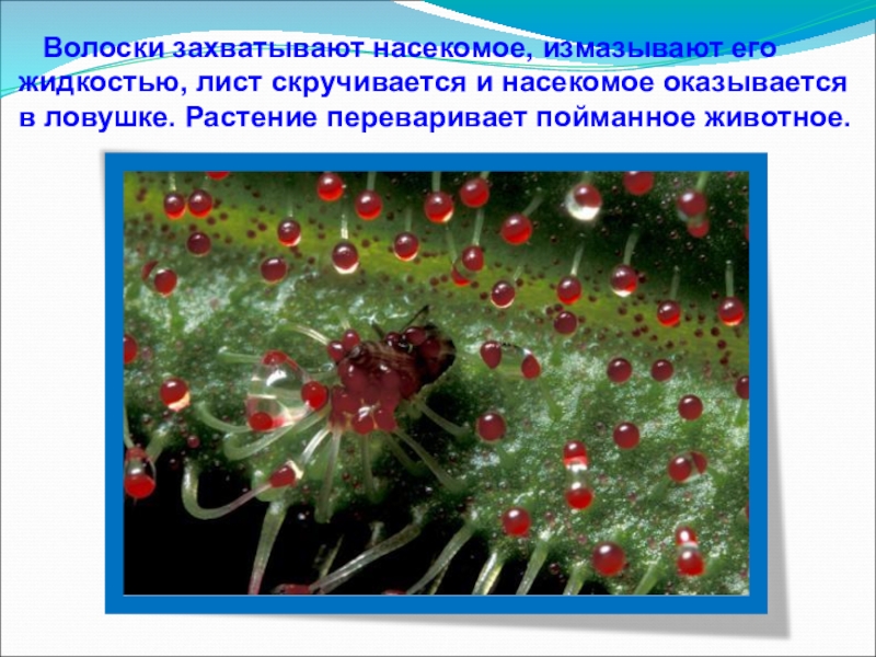 Слайд 10 А у этого хищника на листья не «роса», а «жир»,