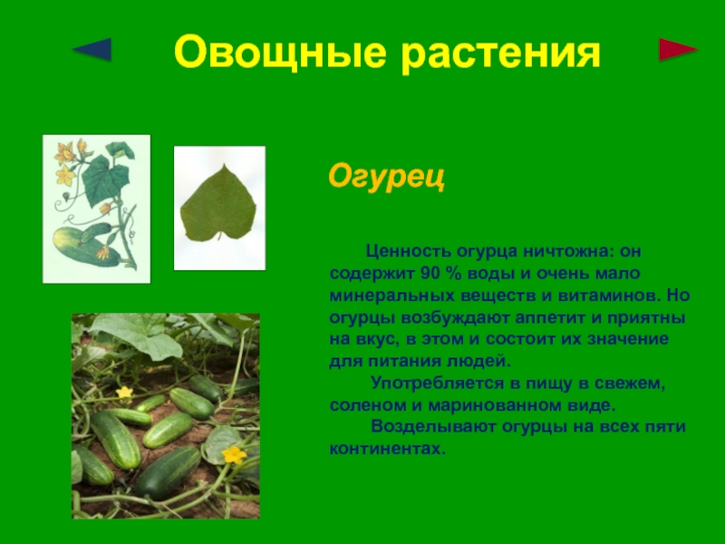 минеральных веществ и витаминов. Но огурцы возбуждают аппетит и приятны на вкус, в этом и состоит их значение для питания людей.