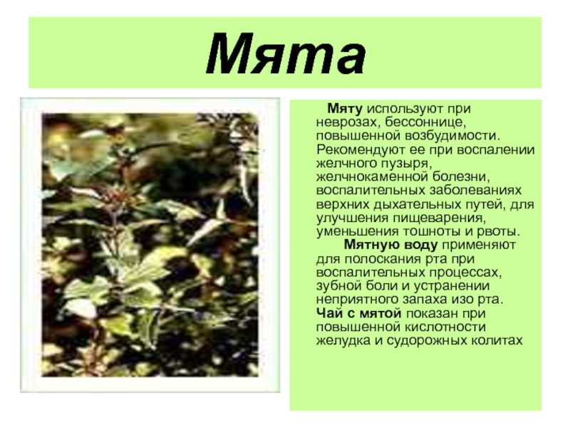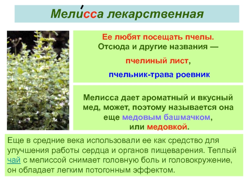 Еще в средние века использовали ее как средство для улучшения работы сердца и органов пищеварения. Теплый чай с мелиссой снимает головную боль и головокружение, он обладает легким потогонным эффектом.