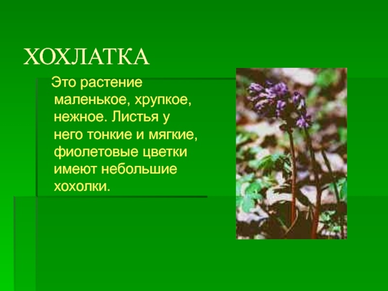 5)Хохлатка – маленькое растеньице с чудесными сиреневыми