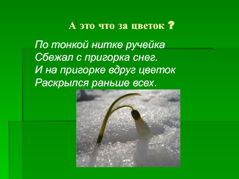 Сбежал с пригорка снег. И на пригорке вдруг цветок Раскрылся раньше всех.