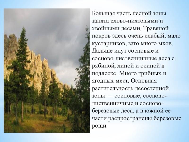 Слайд 6Большая часть лесной зоны занята елово-пихтовыми и хвойными лесами. Травяной покров