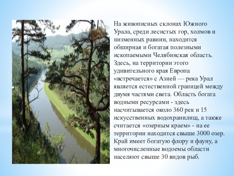 равнин, находится обширная и богатая полезными ископаемыми Челябинская область. Здесь, на территории этого удивительного края Европа «встречается» с Азией — река Урал является естественной границей между двумя частями света. Область богата водными ресурсами - здесь насчитывается около 360 рек и 15 искусственных водохранилищ, а также считается «озерным краем» - на ее территории находится свыше 3000 озер. Край имеет богатую флору и фауну, а многочисленные водоемы области населяют свыше 30 видов рыб.