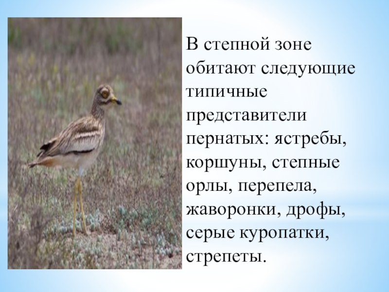 Слайд 20В степной зоне обитают следующие типичные представители пернатых: ястребы, коршуны, степные