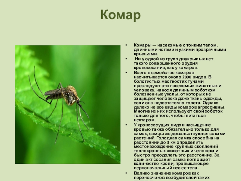 Комары — насекомые с тонким телом, длинными ногами и узкими прозрачными крыльями.