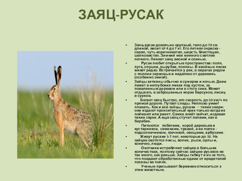 Охотники истребляют зайцев в больших количествах, поэтому сейчас зайцев-русаков не так много, как раньше. Зайцы гибнут и из-за того, что поедают обработанные ядами от вредителей посевы на полях.