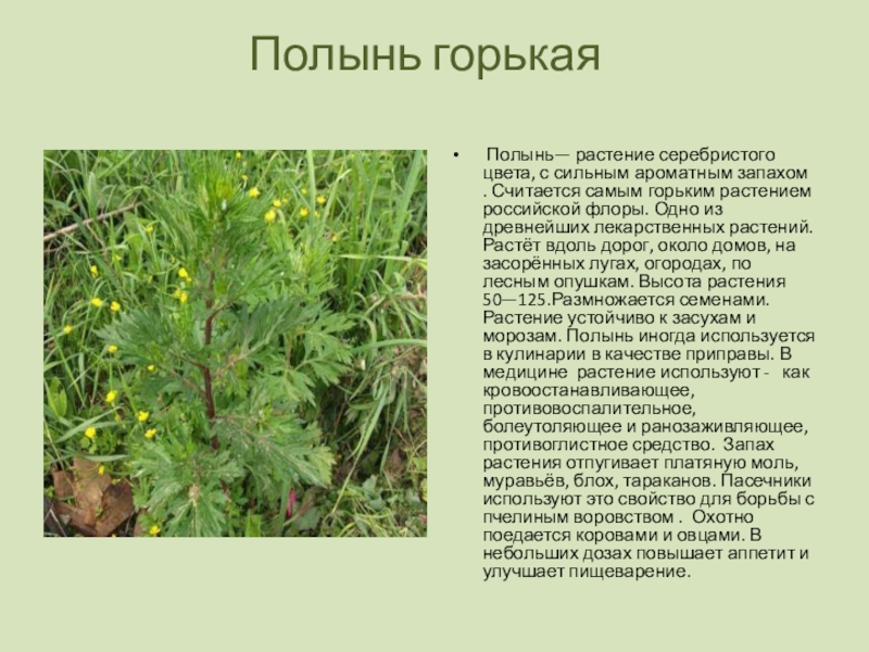 Считается самым горьким растением российской флоры. Одно из древнейших лекарственных растений. Растёт вдоль дорог, около домов, на засорённых лугах, огородах, по лесным опушкам. Высота растения 50—125.Размножается семенами. Растение устойчиво к засухам и морозам. Полынь иногда используется в кулинарии в качестве приправы. В медицине растение используют - как кровоостанавливающее, противовоспалительное, болеутоляющее и ранозаживляющее, противоглистное средство. Запах растения отпугивает платяную моль, муравьёв, блох, тараканов. Пасечники используют это свойство для борьбы с пчелиным воровством . Охотно поедается коровами и овцами. В небольших дозах повышает аппетит и улучшает пищеварение.