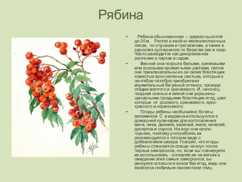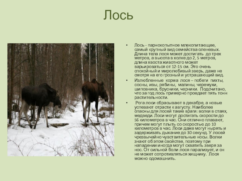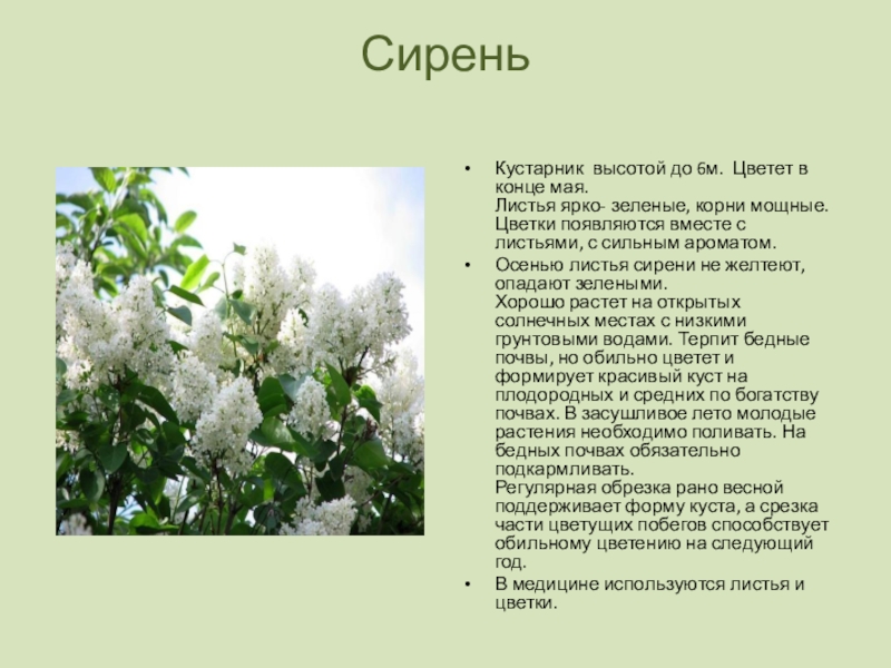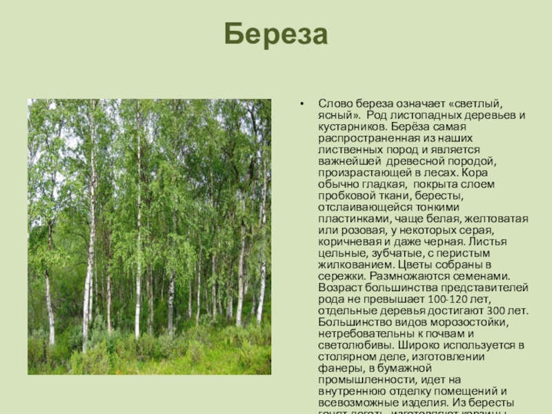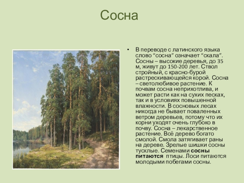 высокие деревья, до 35 м, живут до 150-200 лет. Ствол стройный, с красно-бурой растрескивающейся корой. Сосна – светолюбивое растение. К почвам сосна неприхотлива, и может расти как на сухих песках, так и в условиях повышенной влажности. В сосновых лесах никогда не бывает поваленных ветром деревьев, потому что их корни уходят очень глубоко в почву. Сосна – лекарственное растение. Всё дерево богато смолой. Смола затягивает раны на дереве. Зрелые шишки сосны тусклые. Семенами сосны питаются птицы. Лоси питаются молодыми побегами сосны.