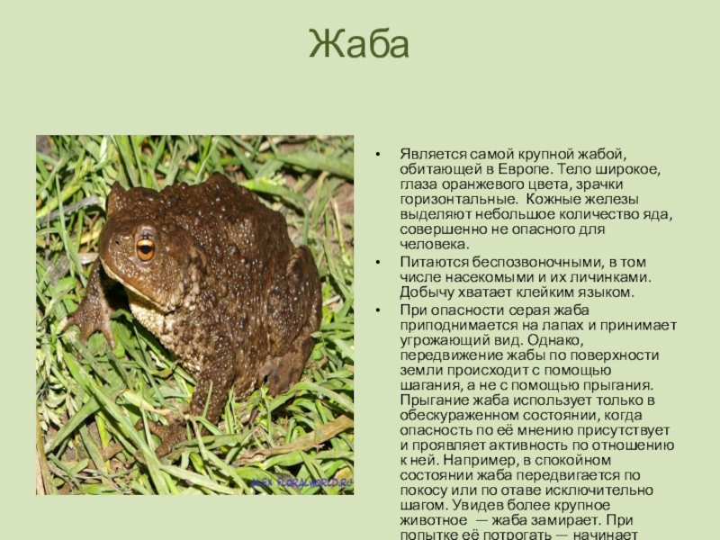 цвета, зрачки горизонтальные. Кожные железы выделяют небольшое количество яда, совершенно не опасного для человека.