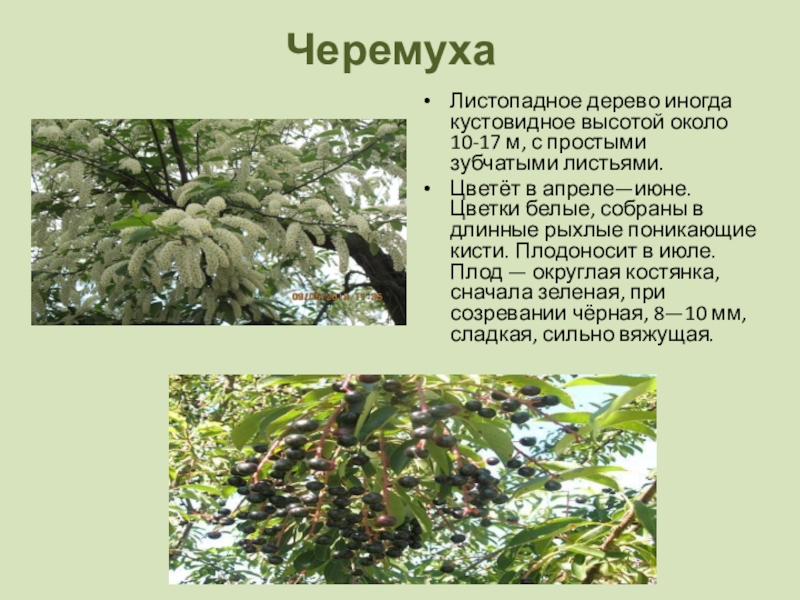 Цветёт в апреле—июне. Цветки белые, собраны в длинные рыхлые поникающие кисти. Плодоносит в июле. Плод — округлая костянка, сначала зеленая, при созревании чёрная, 8—10 мм, сладкая, сильно вяжущая.