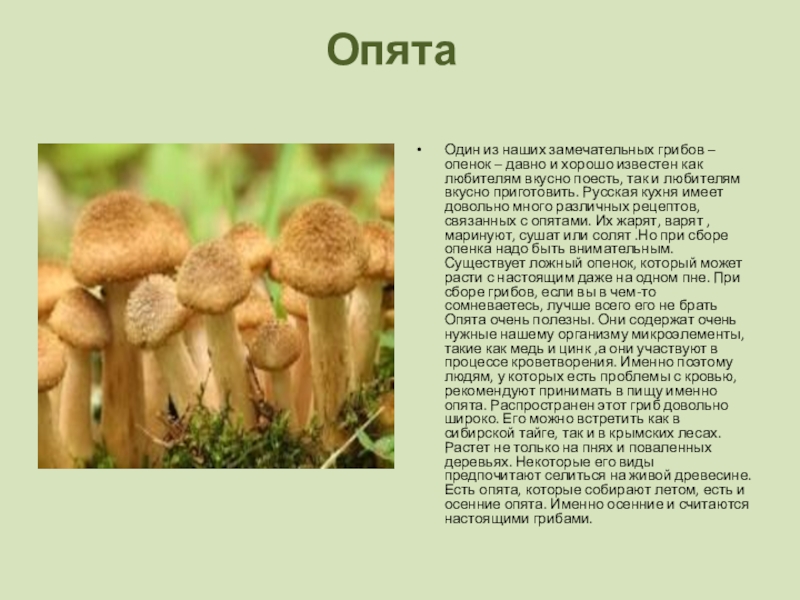 известен как любителям вкусно поесть, так и любителям вкусно приготовить. Русская кухня имеет довольно много различных рецептов, связанных с опятами. Их жарят, варят ,маринуют, сушат или солят .Но при сборе опенка надо быть внимательным. Существует ложный опенок, который может расти с настоящим даже на одном пне. При сборе грибов, если вы в чем-то сомневаетесь, лучше всего его не брать Опята очень полезны. Они содержат очень нужные нашему организму микроэлементы, такие как медь и цинк ,а они участвуют в процессе кроветворения. Именно поэтому людям, у которых есть проблемы с кровью, рекомендуют принимать в пищу именно опята. Распространен этот гриб довольно широко. Его можно встретить как в сибирской тайге, так и в крымских лесах. Растет не только на пнях и поваленных деревьях. Некоторые его виды предпочитают селиться на живой древесине. Есть опята, которые собирают летом, есть и осенние опята. Именно осенние и считаются настоящими грибами.