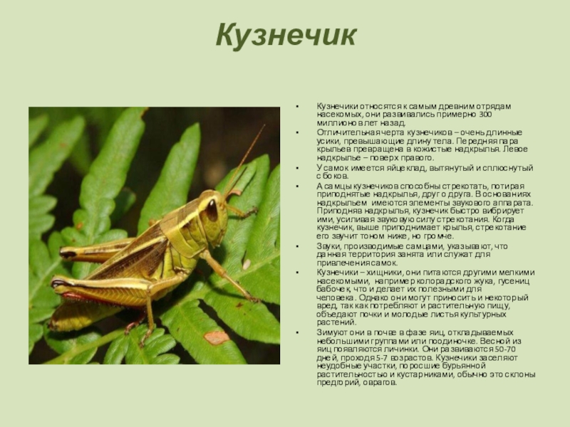 Отличительная черта кузнечиков – очень длинные усики, превышающие длину тела. Передняя пара крыльев превращена в кожистые надкрылья. Левое надкрылье – поверх правого.