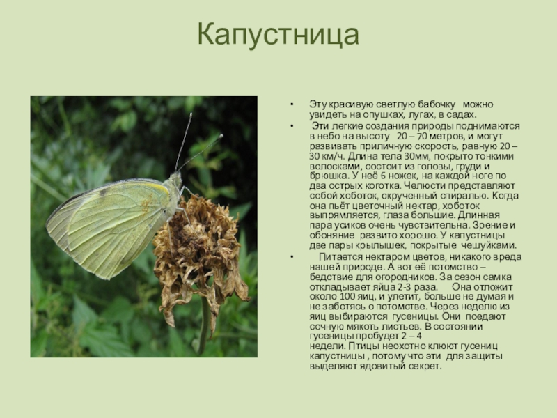 Эти легкие создания природы поднимаются в небо на высоту 20 – 70 метров, и могут развивать приличную скорость, равную 20 – 30 км/ч. Длина тела 30мм, покрыто тонкими волосками, состоит из головы, груди и брюшка. У неё 6 ножек, на каждой ноге по два острых коготка. Челюсти представляют собой хоботок, скрученный спиралью. Когда она пьёт цветочный нектар, хоботок выпрямляется, глаза большие. Длинная пара усиков очень чувствительна. Зрение и обоняние развито хорошо. У капустницы две пары крылышек, покрытые чешуйками.