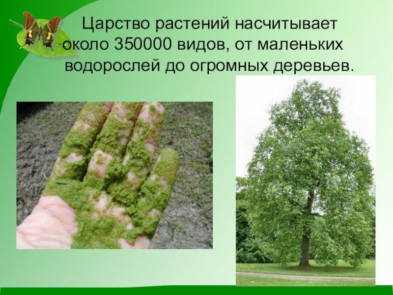 Слайд 2 Царство растений насчитывает около 350000 видов, от маленьких водорослей до огромных