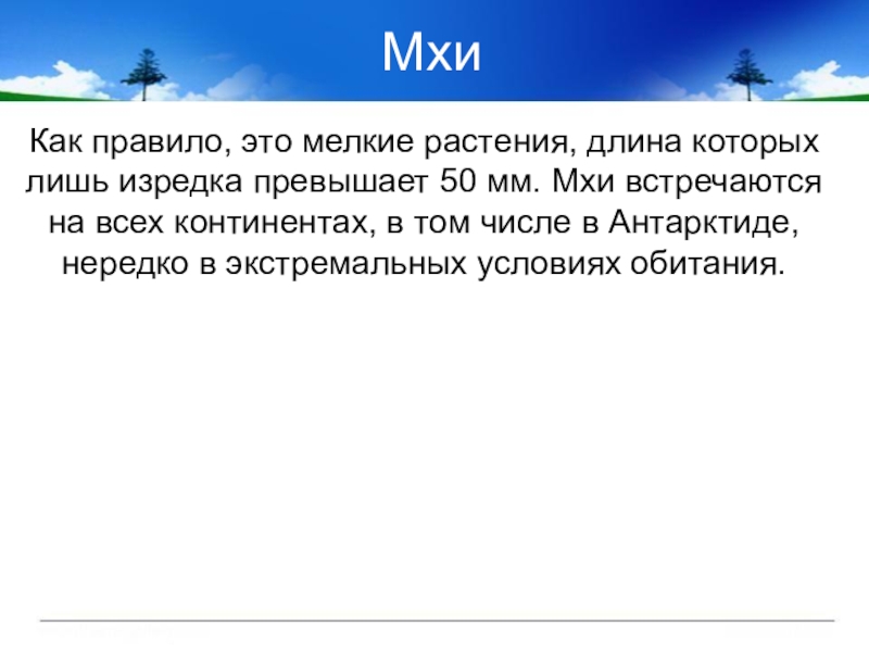 мм. Мхи встречаются на всех континентах, в том числе в Антарктиде, нередко в экстремальных условиях обитания.