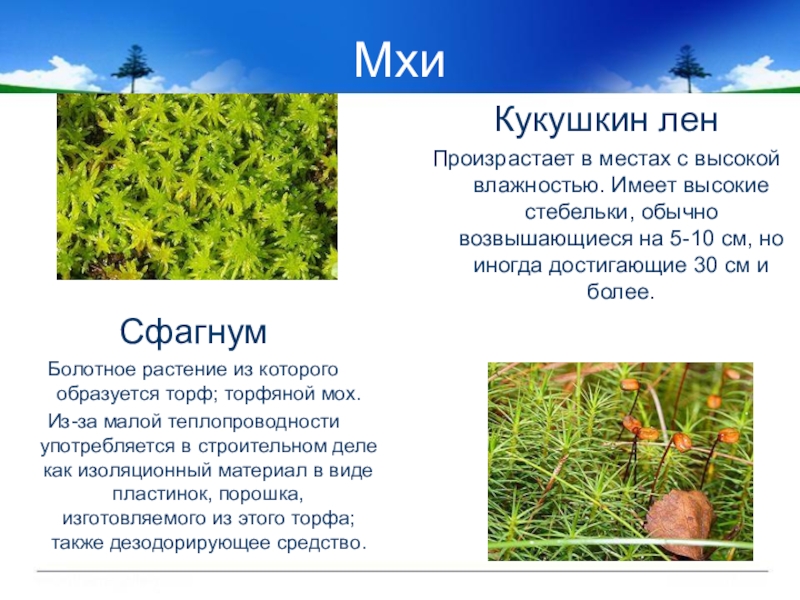 видов мхов. Они имеют стебли и листья, но у них нет корней.