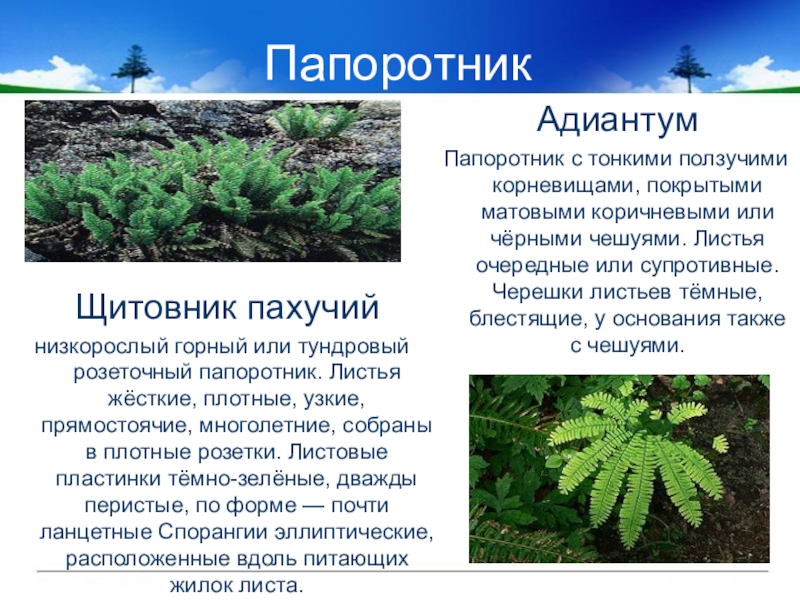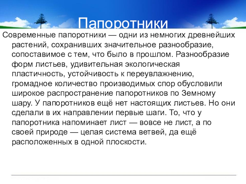 разнообразие, сопоставимое с тем, что было в прошлом. Разнообразие форм листьев, удивительная экологическая пластичность, устойчивость к переувлажнению, громадное количество производимых спор обусловили широкое распространение папоротников по Земному шару. У папоротников ещё нет настоящих листьев. Но они сделали в их направлении первые шаги. То, что у папоротника напоминает лист — вовсе не лист, а по своей природе — целая система ветвей, да ещё расположенных в одной плоскости.