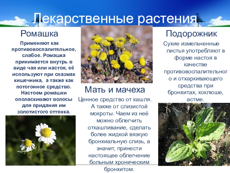 Применяют как противовоспалительное, слабое. Ромашка принимается внутрь в виде чая или настоя, её используют при спазмах кишечника, а также как потогонное средство. Настоем ромашки ополаскивают волосы для придания им золотистого оттенка.