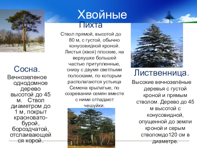 Листья хвойных деревьев видоизменены и имеют форму длинных , тонких