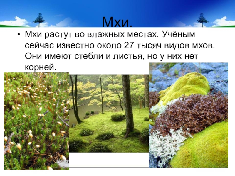 Мхи растут во влажных местах. Учёным сейчас известно около 27 тысяч